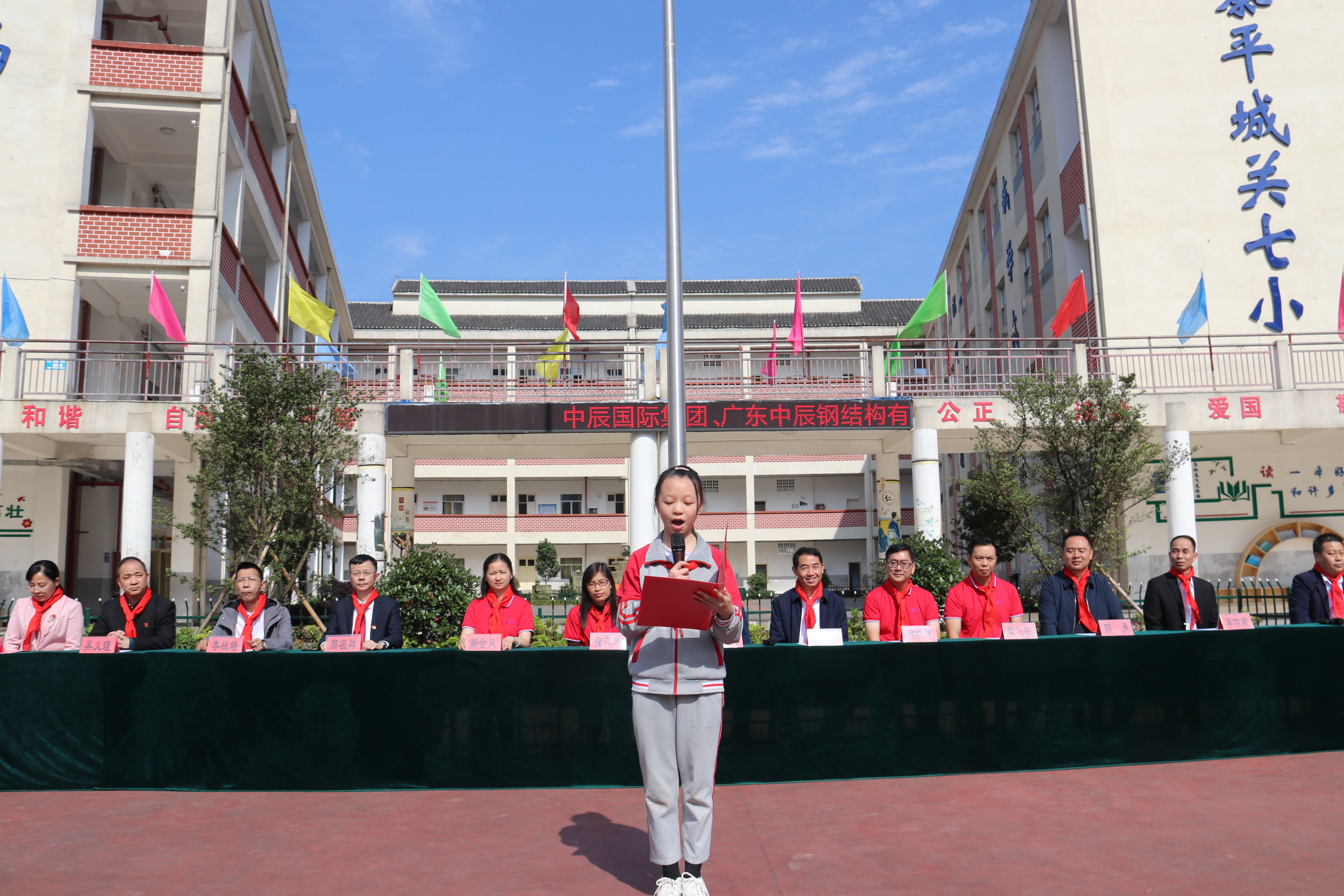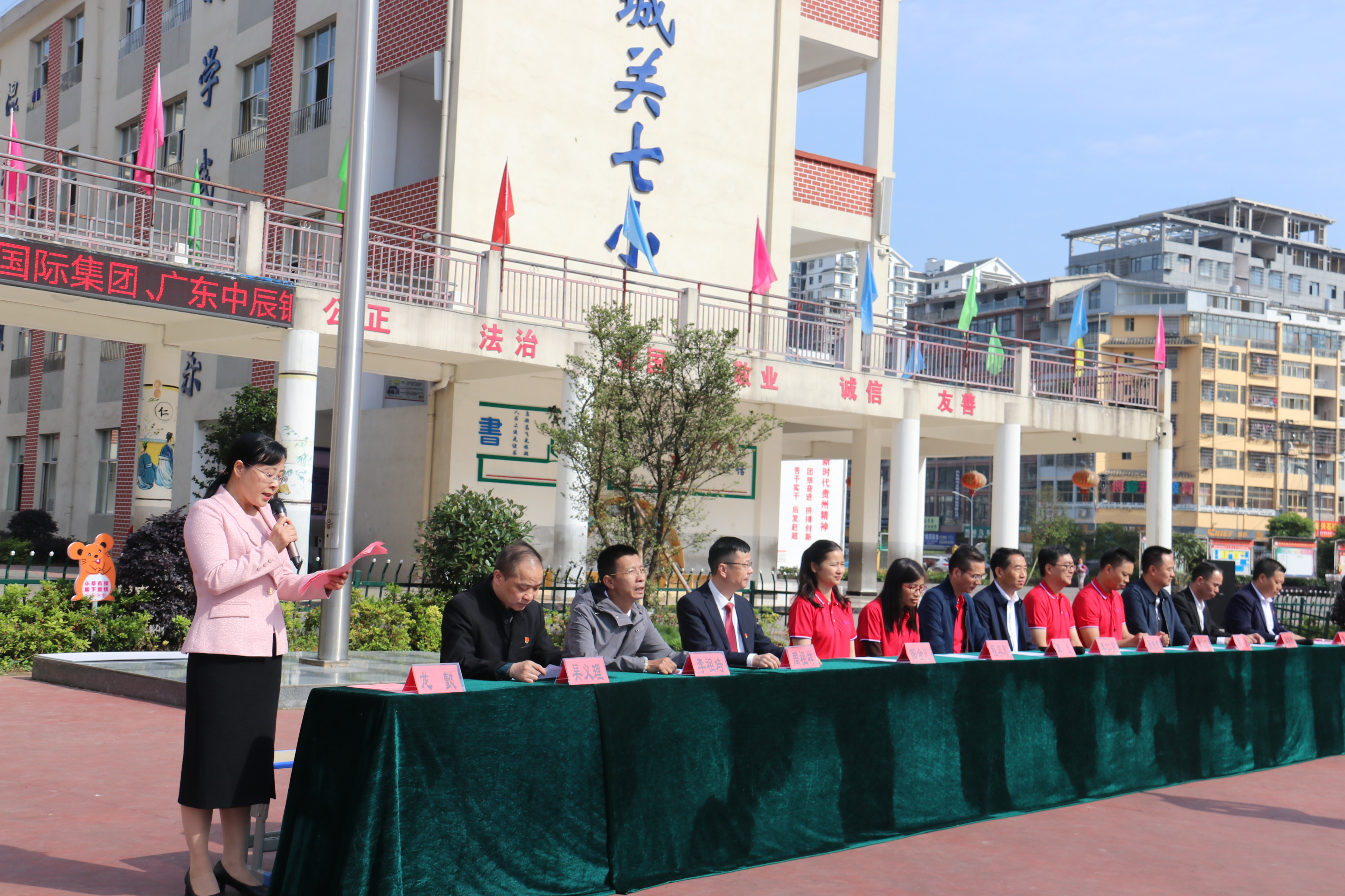 捐赠仪式上,首先由黎平县城关第七小学学生代表为主席台上的领导和嘉宾敬献并佩戴红领巾。