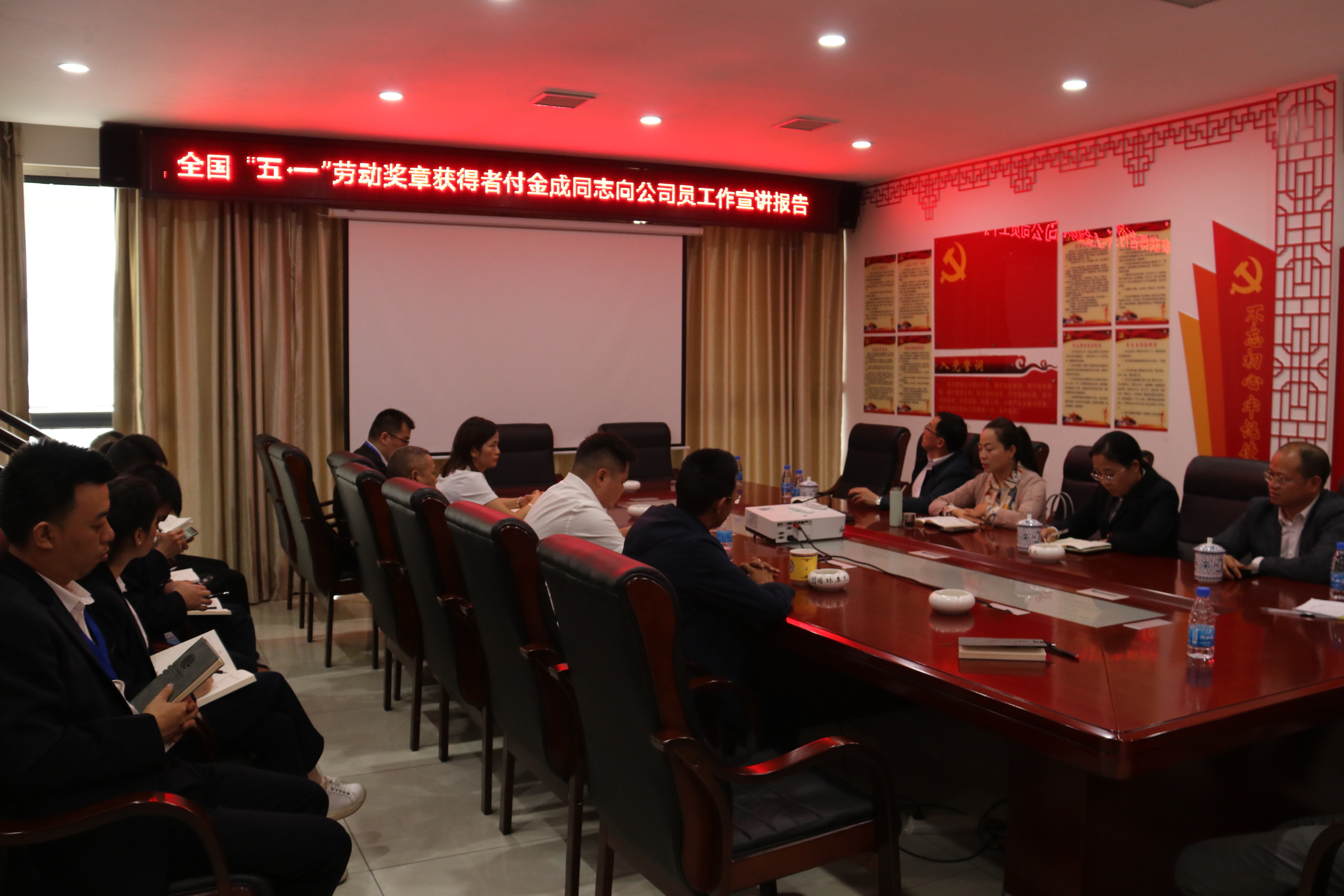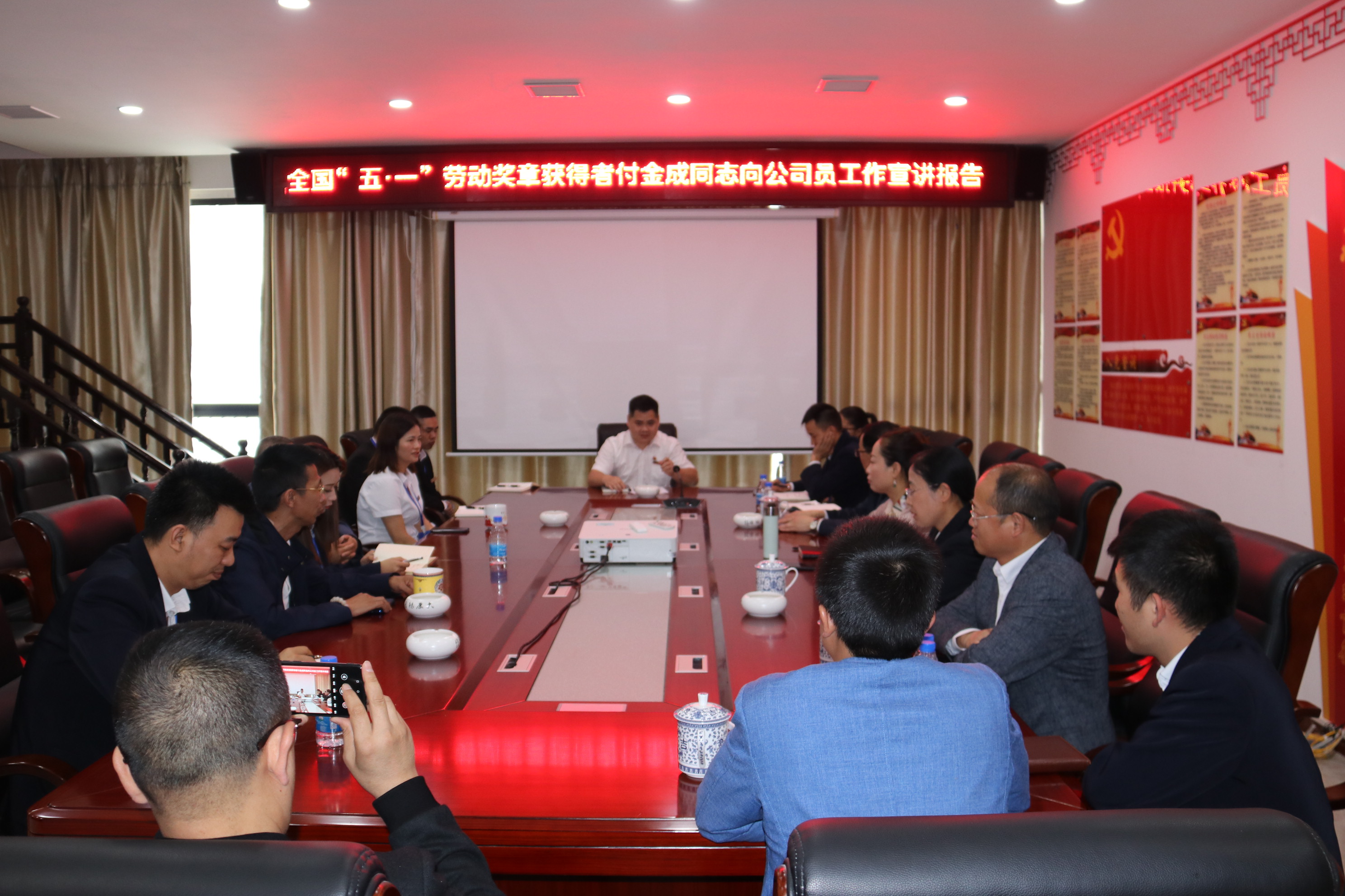 2021年5月30日下午,MILAN米兰体育·(中国)官方网站在公司会议室举行全国五一劳动奖章获得者宣讲报告会,县人大常委会副主任、县工商联主席邰胜英、县委两新工委专职副书记杨旭、县委统战部副部长潘承渊、县总工会党组书记龙懿、县住建局副局长陆正彩等和MILAN米兰体育·(中国)官方网站副董事长付清武、总经理李祖培以及公司全体员工,听取了荣获全国“五一劳动奖章”荣誉称号的付金成同志的宣讲报告,并与付金成同志进行座谈、互动交流。