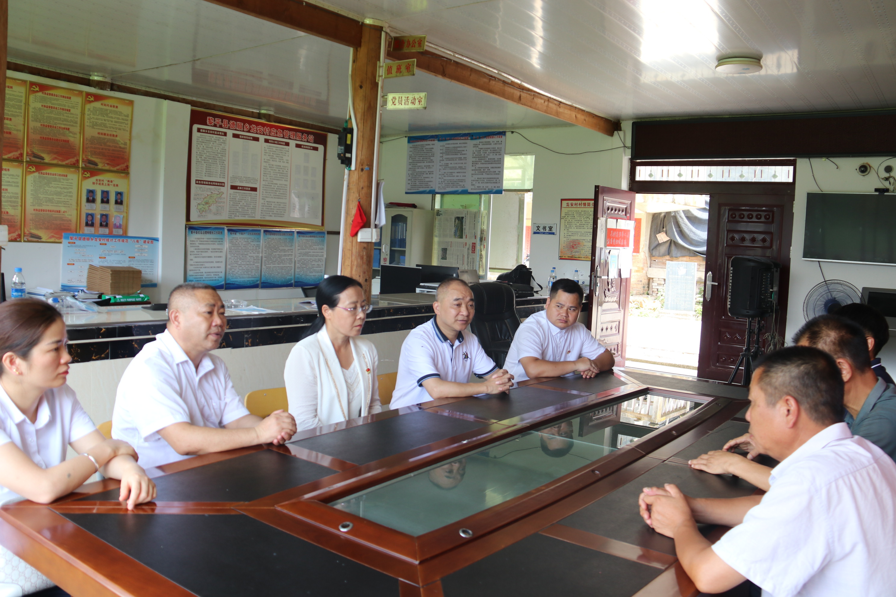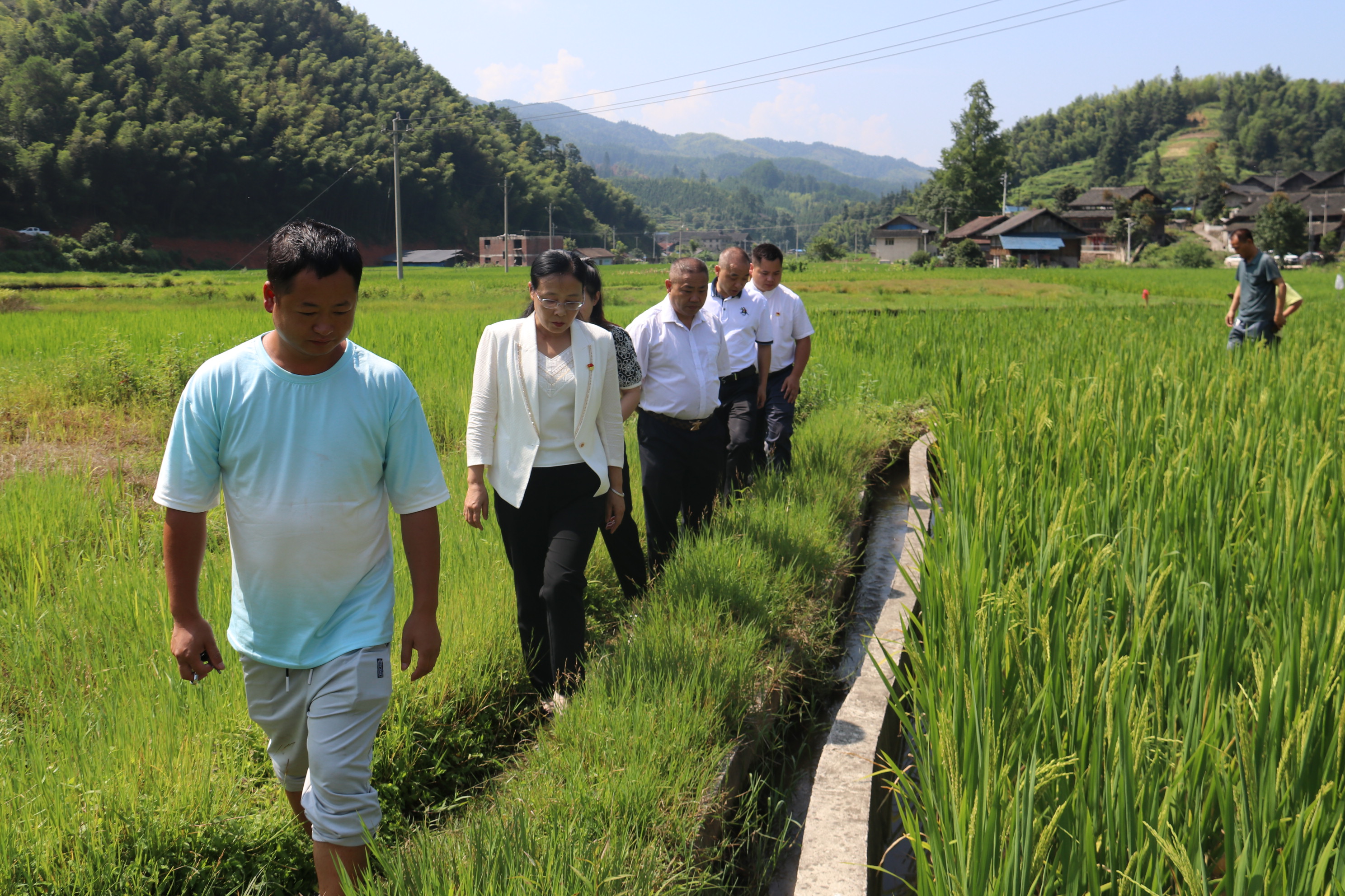 到达黎平县德顺乡龙安村后,在龙安村两委班子成员及村民的陪同下,几位领导不辞辛劳,顶着烈日,来到田间地头,实地察看龙安村农作物生产和农田水利基础设施状况。随后在村委会会议室举行了座谈会。